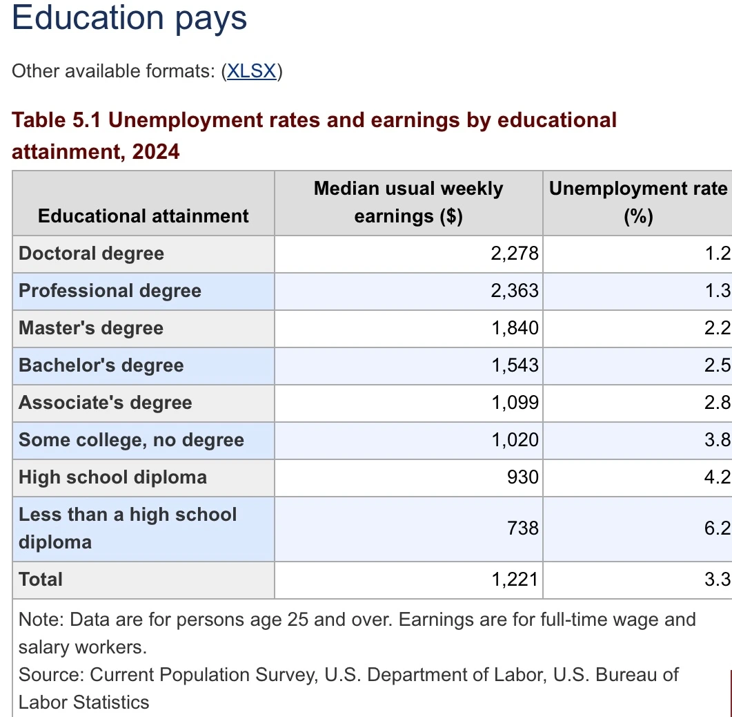 미국 노동통계청(BLS) ‘Education pays’ 표(2024년, 25세 이상 전일제)의 주당 중위임금은