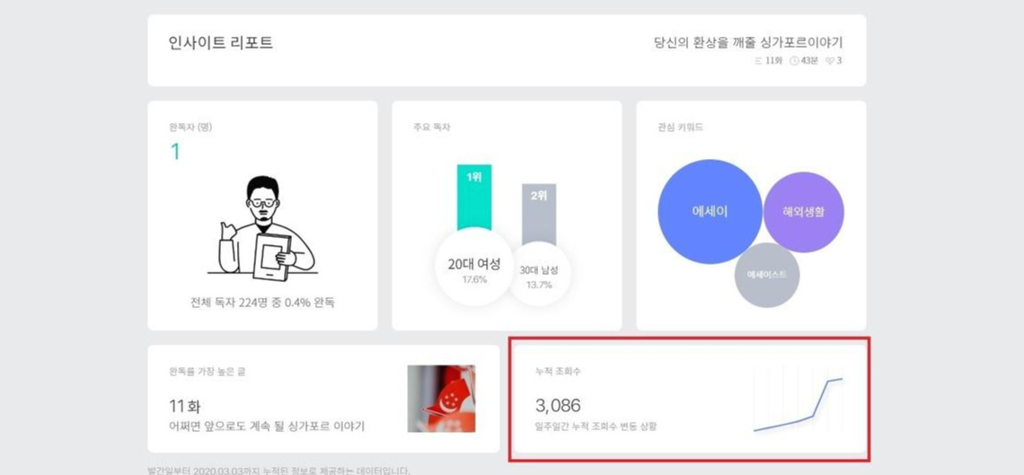 지금 당신의 환상을 깨줄 싱가포르 이야기에는 총 11개의 글이 있고 현 시각 기준으로 총 5133회의 조회수를 기록한 것으로 확인했다. 이 중에는 글을 발행한 뒤 브런치북으로 묶이기 전에 2일 정도 다음 메인에 노출되었던 "4차혁명, 어쩌면 싱가포르의 시대가 될지도"라는 글도 포함되어 있어서 내가 실제로 카운팅 한것이 좀 더 높은게 당연할지도 모른다. 아쉬운 점은 누적 조회수가 브런치북으로 만들어진 후를 기준으로 반영이 된다는 것이다.