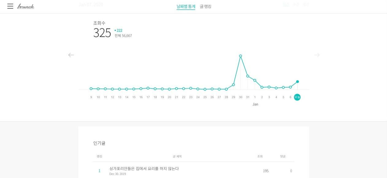 그리고 마지막으로 끝끝내 어디에 노출 된건지 찾지 못한 글이다. 사실 오늘 이 글을 쓰게된 계기다. 브런치북 발행 프로젝트에 포함된 글 중 가장 인기 있는 글 중 하나인 싱가포리안들은 집에서 요리를 하지 않는다 라는 글이 있다. 이 글은 가끔식 이렇게 1일 100~300정도의 조회수를 깜짝선물처럼 주곤 한다.
