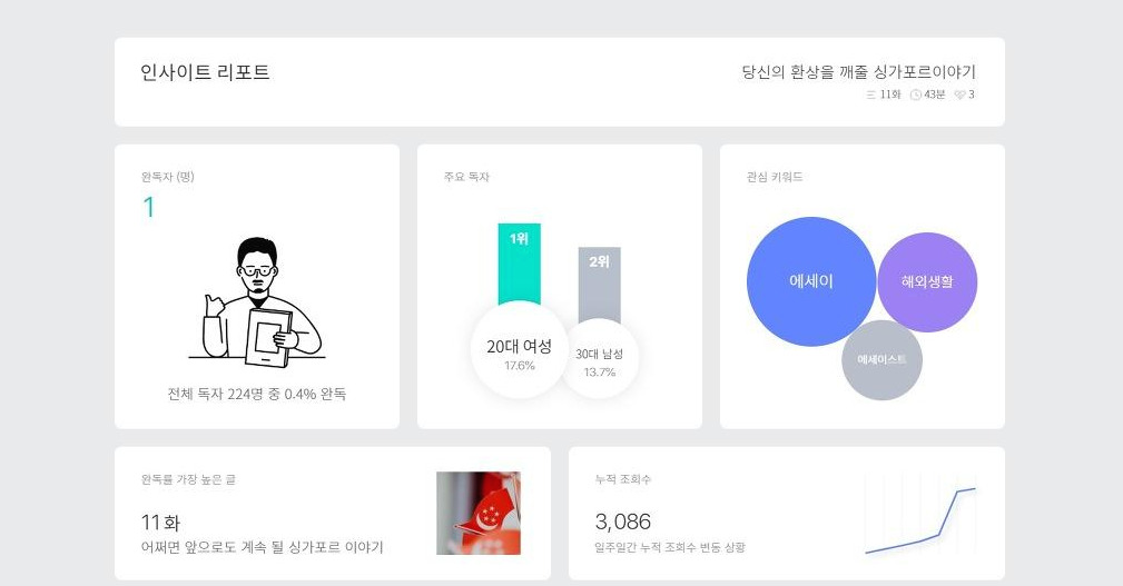 그리고 전체 독자수의 기준이 궁금하다. 누적 조회수와 일치 하지 않는 것을 보니 한편의 글을 처음부터 끝까지 다 읽은 경우만 독자로 분류하는 것 같다.