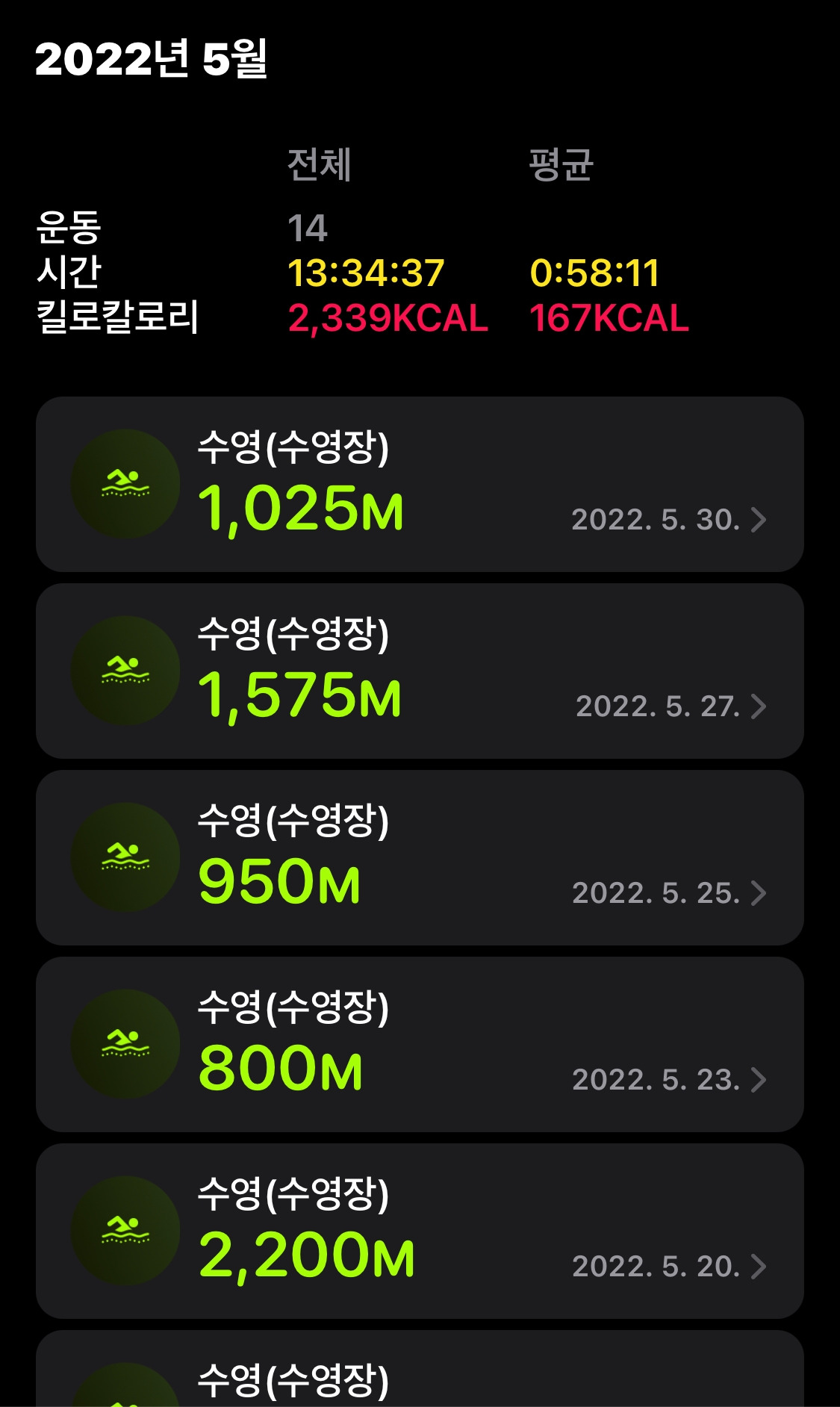 6월에는 쉬는 날이 두 번이나 있어서 그만큼 운동량을 채우리라 다짐했다. 쉬는 날인만큼 평소보다 많은 양의 훈련을 준비했는데 아뿔싸 두 날 모두 애플워치를 두고 온 것이다. 수영 가는 길이 그렇게 짜증나고 나 자신이 한심할 수가 없었다. 그런데 문득 수영장에 들어가니 애플워치 기록이 뭐 그렇게 중요한가 싶어 수영장 가는 내내 짜증냈던 나 스스로에게 약간 무안해졌다.