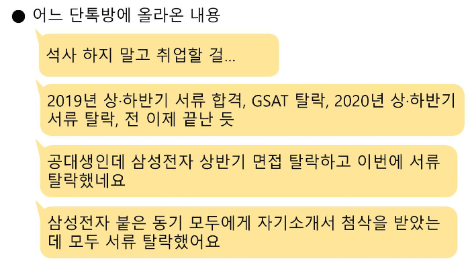 자소서는 채용담당자가 요구하는 질문에 대응하는 자기의 이야기를 작성한다. 그런데 읽다 보면 느낌이 전달되는 글이 별로 없다. 나름대로 최선을 다해 썼다고 하지만, 서류 전형에서 탈락하는 인원이 적지 않다. 서류 전형을 통과해야 직무적성 검사라도 받아봐서 본인의 실력이 어느 정도인지 가늠할 수 있는데 아예 서류 단계에서 탈락하고 나면 거절당한 생각에 자존감도 낮아지고 자괴감이 들기도 한다. 아래는 2020년 하반기 삼성전자 서류 전형 결과를 발표한 직후 서울대생 단톡방에 올라온 내용이다. 자소서의 중요성을 엿볼 수 있는 내용이다.