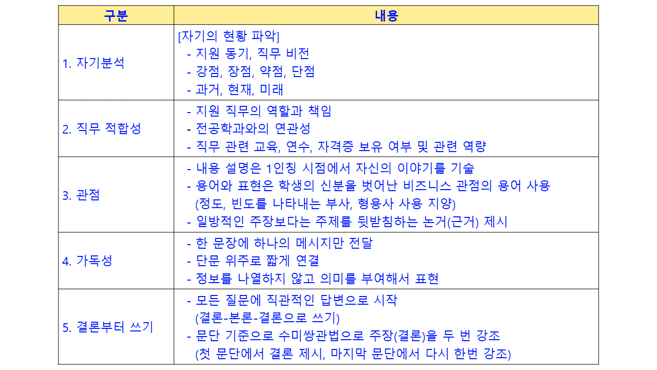 지원자가 전달하고 싶은 내용을 채용담당자가 가장 보고 싶은 내용으로 바꾸어 작성할 수 있어야 한다. 구태의연한 내용으로 관심을 끌 수는 없다. 지원자에 관해 흥미를 갖고 관심을 보일만 한 내용으로 적어야 한다. 가장 전달하고 싶은 말을 가장 먼저 전달하는 게 바람직하다. 글을 쓰다 보면 알겠지만, 지원자의 의도대로 글이 잘 써지지 않을 가능성이 크다. 앞에서 언급한 다섯 가지 답변을 다시 한번 요약하면 다음과 같다. 실제로 자소서를 쓸 때 착안 사항으로 반드시 기억하고 있어야 하는 내용이다.