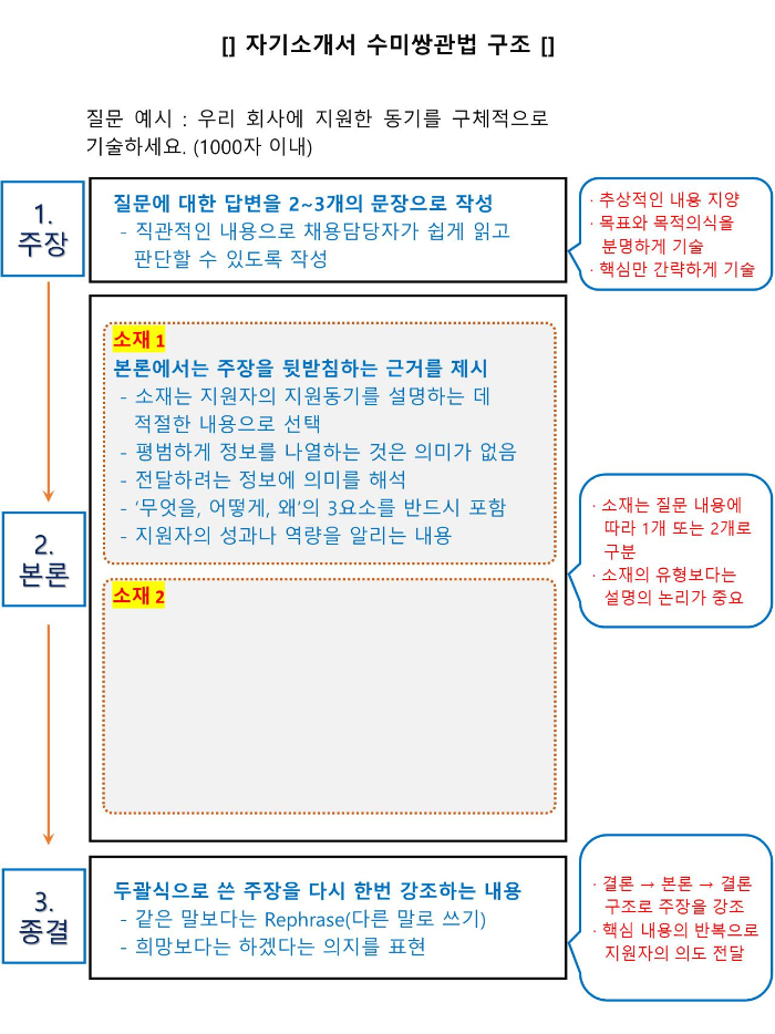 자소서의 답변 전개는 반드시 주장(답변이고 주제이며 동시에 결론)을 먼저 쓰고, 본론에서 주장에 대한 논거를 제시한다. 여기에 주장을 다시 한번 강조하면서 결론으로 종결부로 구성하면 읽는 사람이 쉽게 이해하는 자소서를 쓸 수 있다.