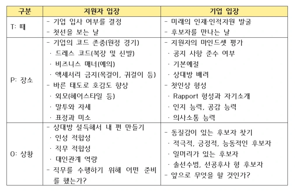 그렇게 진행한 이유는 TPO가 중요한 요소로 작용하기 때문이다. 사람은 때(time), 장소(place), 상황(occasion)의 지배를 받는다. 기업의 입장에서 지원자를 평가하는데 세 가지의 영향력을 무시하기는 어렵다. 물론 지원자의 입장에서도 그 기업에 직접 방문하여 면접하는 것이 좋다. 아래의 도표는 TPO를 기업과 지원자의 입장에서 해석한 내용이다.