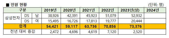 2020년부터 2022년 사업보고서와 2023년 반기보고서(3월 12일 현재, 2023년 사업보고서 미공시)를 참고하면, 삼성전자 DS부문의 인원 변동 사항을 알 수 있다.