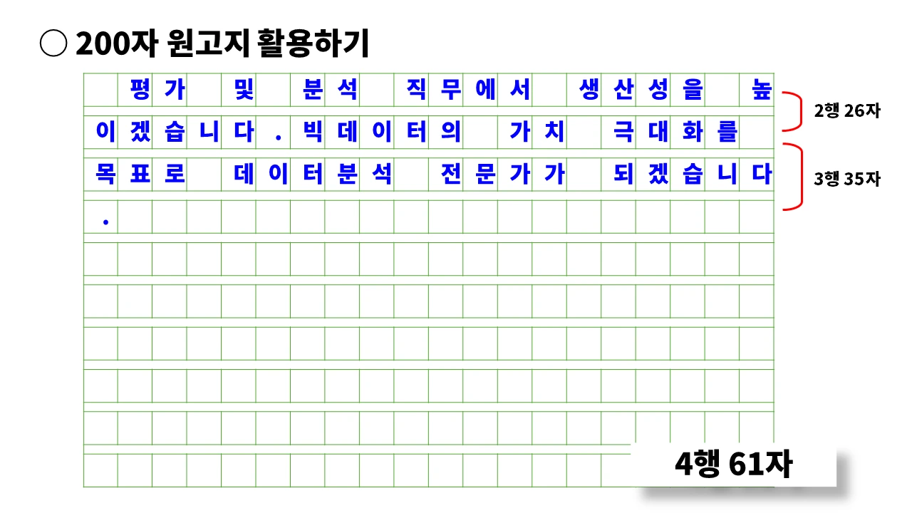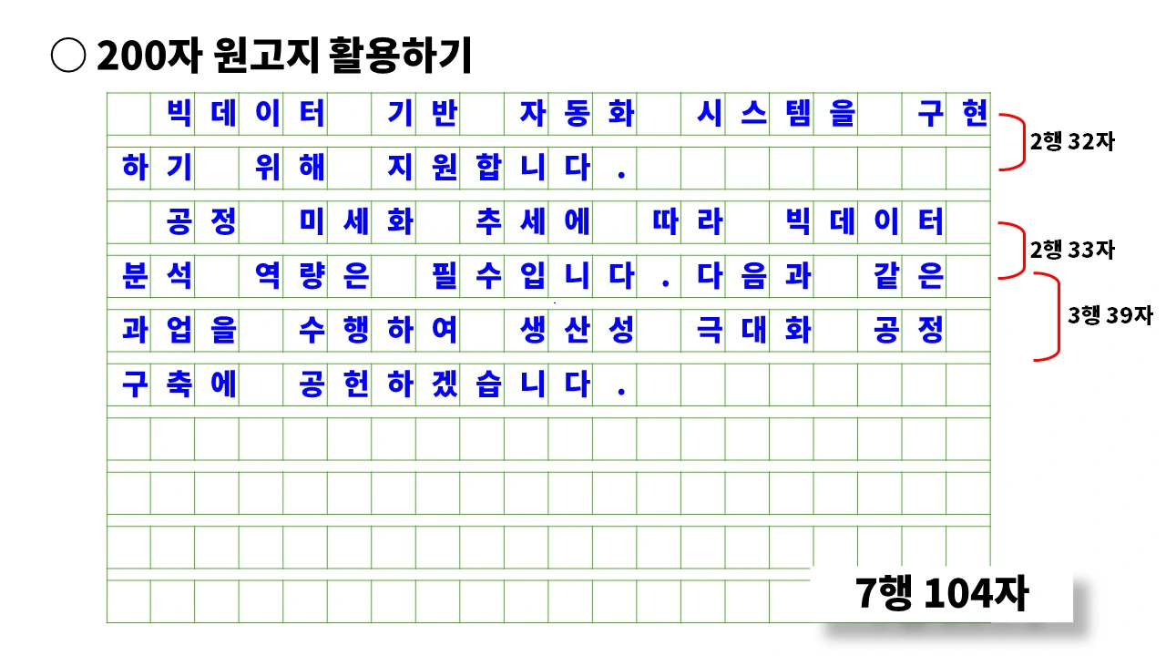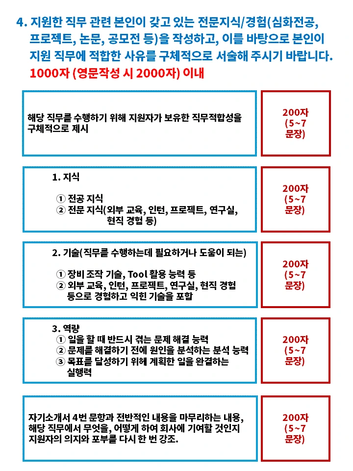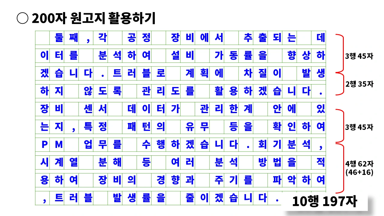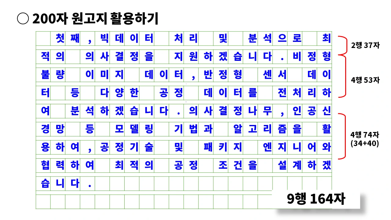 이러한 내용을 정리하는 이유는 단순하다. 지원자가 이 직무에 지원하기 위해서 어떠한 준비를 해왔는지, 지원자의 어떤 역량(강점)과 장점이 무엇인지 설명하면 된다. 다음과 같이 200자 원고지를 활용하며 작성하여, 왜 지원자가 이 직무에 적합한 후보자인지 주장하는 논거가 분명하게 표현되어야 한다.