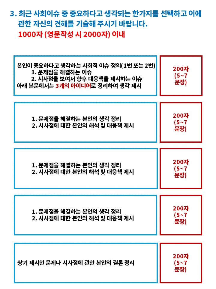 여기서 중요한 건 지원자가 선택한 이슈가 무엇인지가 아니다. 이슈에 대한 지원자의 생각이 무엇인지 전달하는 데 집중해서 기술해야 한다. 견해는 사안을 보고 어떻게 해석하는지 지원자의 생각을 알려달라는 의미이다. 즉 글에서 지원자의 사고방식이나 문제를 바라보는 시각 등이 그대로 드러난다. 또한 이슈에 관한 해석은 지적 수준을, 문제해결을 위한 대안 제시는 능력을 보여주기 때문이다.