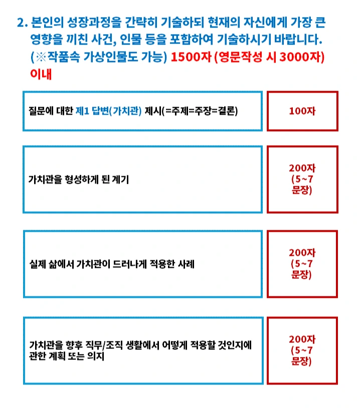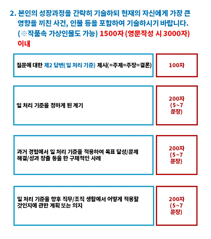 성장 과정이 나오니 과거 중학교, 고등학교 시절의 이야기, 심지어 초등학교 시절의 에피소드를 쓰는 지원자도 있다. 어떠한 주제를 정리하여 제시해도 크게 상관은 없지만, 무엇보다도 질문의 의도가 무엇인지 파악하는 게 중요하다. 삼성에서 2번 질문을 제시한 목적은 단순하다. 지원자가 어떠한 사람인지 알려달라는 내용이다. 글자 수가 1,500자나 되기 때문에 읽는 사람의 가독성을 고려하여 주제를 두 가지로 나누어서 적는 게 바람직하다.