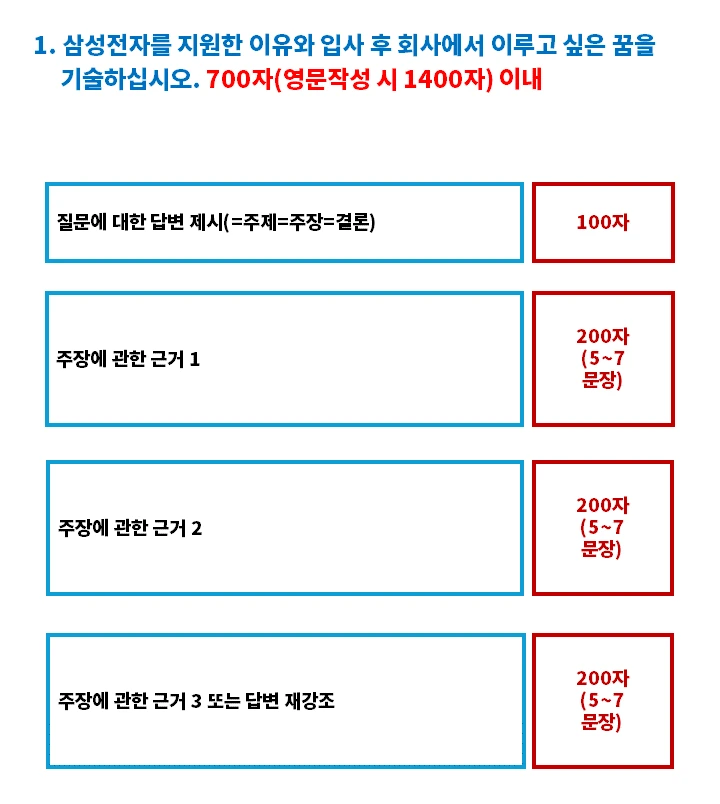 첫째 질문에는 삼성전자에 입사하려는 지원자의 동기가 무엇인지 기술한다. 지원동기를 작성할 때는 삼성전자가 좋아서 지원하는 이유보다는 지원자가 왜 필요한 사람인지 알리는 내용이어야 한다. 삼성전자가 초일류 기업이고, 메모리반도체 분야 세계 1위이고, 최첨단 기술력을 보유하고 있는 등의 내용이 지원자를 뽑아야 하는 이유가 되지 않는다. 이미 누구나 다 아는 내용일뿐더러, 삼성전자가 잘한다고 해서 지원자를 뽑아야 할 이유는 없기 때문이다. 회사는 해당 직무에서 전문성을 발휘하여 성과를 낼 수 있는 인재 후보를 채용하려는 목적으로 지원을 받는다. 그렇다면 지원자가 왜 삼성전자 그 직무에 적합한 후보인지를 객관적으로 설명하는 내용을 제시해야 한다. 즉 직무적합성으로 대응해야 하는 질문이다.