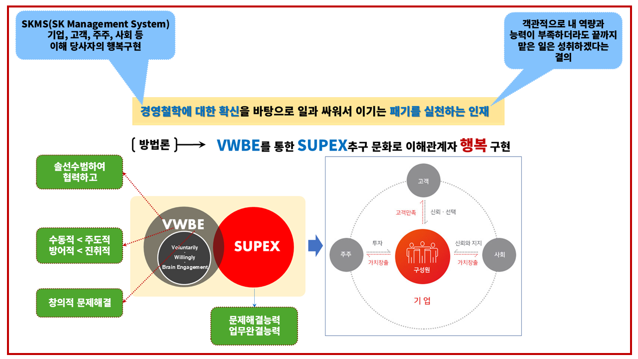 SK그룹은 창업주가 SKMS를 경영철학으로 삼고 있다. 경영철학이라는 건 경영의 방향성을 정하는 일종의 이념과 같다. SK는 기업, 고객, 주주, 사회, 여기에 실제로 일하는 직원까지 이해당사자로 규정하여, 각각의 행복을 추구하는 것을 경영철학의 근간으로 설명하고 있다. 특히 이러한 경영철학을 실현하기 위해서는 기업의 존재 목적인 이윤 추구가 빠질 수 없다. 예를 들어 아무리 좋은 기업 철학이 있다 하더라도 돈을 벌지 못하는 기업은 존속할 수 없기 때문에 무엇보다도 먼저 이익을 내는 기업이 되어야 한다. 기업은 지속적인 이윤을 창출하기 위해 직원을 새롭게 뽑는다고 생각하면 된다.