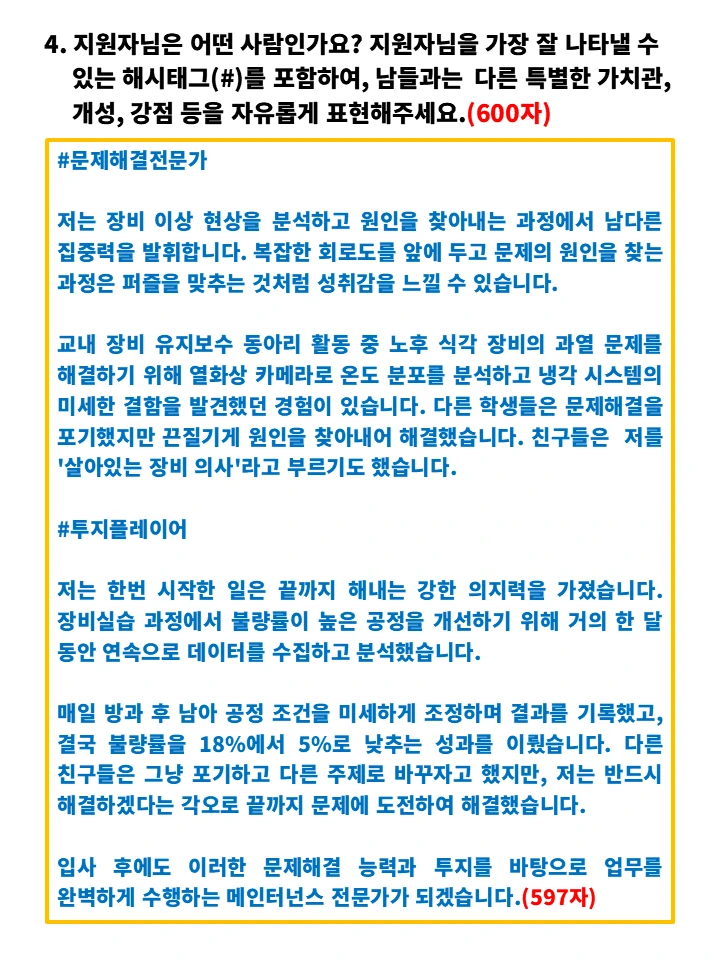 해시태그로 표현하라고 했으니, 해시태그 문법에 따라 공란이 없이 모든 단어를 붙여서 쓰면 된다. 의미를 정확하게 전달하고 싶다면 언더바(예: #문제_해결_전문가)를 사용하여 표기하면 된다. 1~3번의 질문과는 다르게 4번은 지원자의 생각을 전달하면 된다. 1~3번 질문이 직무와 연관된 지원자의 지식, 기술, 경험, 역량 등을 묻는 거라면 4번은 철저하게 지원자가 어떤 사람인지 묻기 때문에 질문의 성격이 다르다.