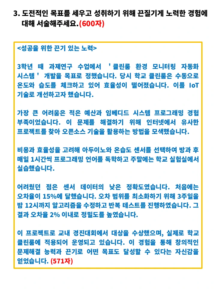 3. 도전적인 목표를 세우고 성취하기 위해 끈질기게 노력한 경험에 대해 서술해주세요. (600자)