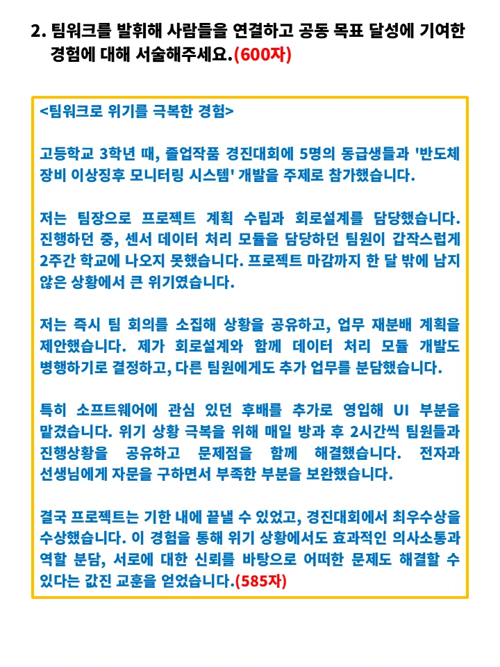 3번은 과연 지원자가 이런 사람인지 증명하라는 항목이다. 기업은 문제를 해결하여 자신의 업무를 완결하여 기업의 경영목표 달성에 도움이 되는 인재를 희망한다. 지원자 자신이 목표지향적이고 성과지향적인 후보라는 걸 잘 드러내야 한다.