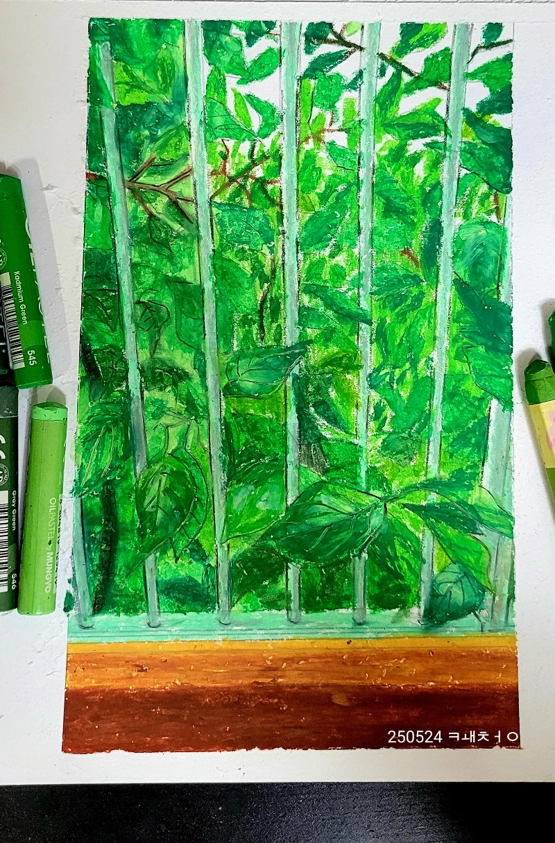 오늘은 내 방 창문으로 보이는 풍경을 그렸다. 바깥에 심긴 감나무는 이제 17년 정도 나이를 먹었다. 여름이 되며 잎사귀가 날로 무성해진다. 느리게 자라는가 싶더니 어느새 아파트 4층 높이로 자라난 감나무처럼 내 안의 감사하는 힘도 그렇게 자라길 바란다.