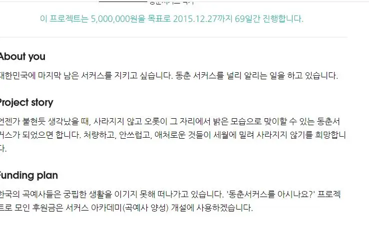 작년에는 직접 글을 올려 , 스토리 펀딩을 받으며 태양의 서커스를 벤치마킹하겠다는 동춘 서커스의 야심 찬 글을 보았다. 그러나 5백만 원 목표에 1백만 원을 채우고 끝이 났다. 음. 이게 현실인 거 같다.