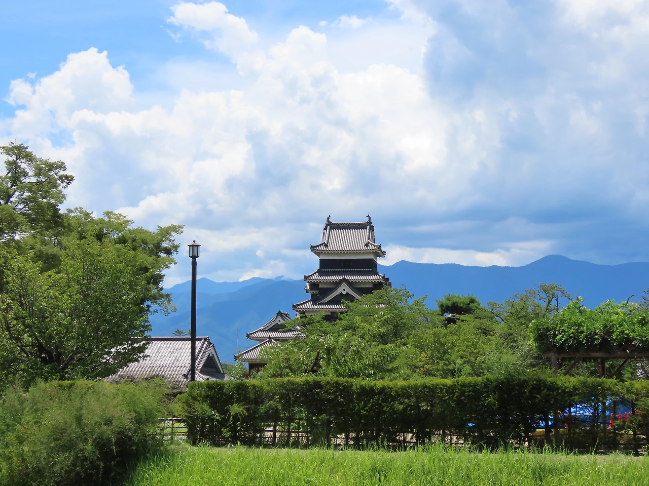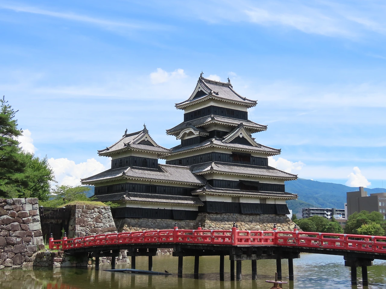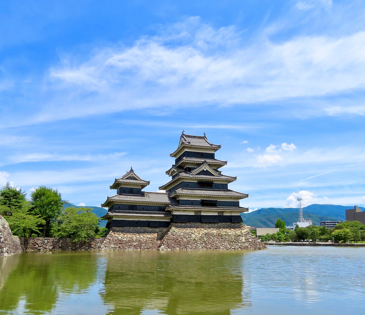 특유의 어두운 색으로 까마귀 성이라 불리기도 하는 마츠모토 성은 일본에서 유일하게 전국 시대와 에도 시대의 서로 성격이 다른 두 양식이 공존하는 건축물이라 한다.