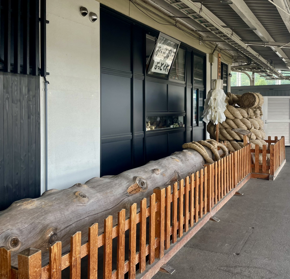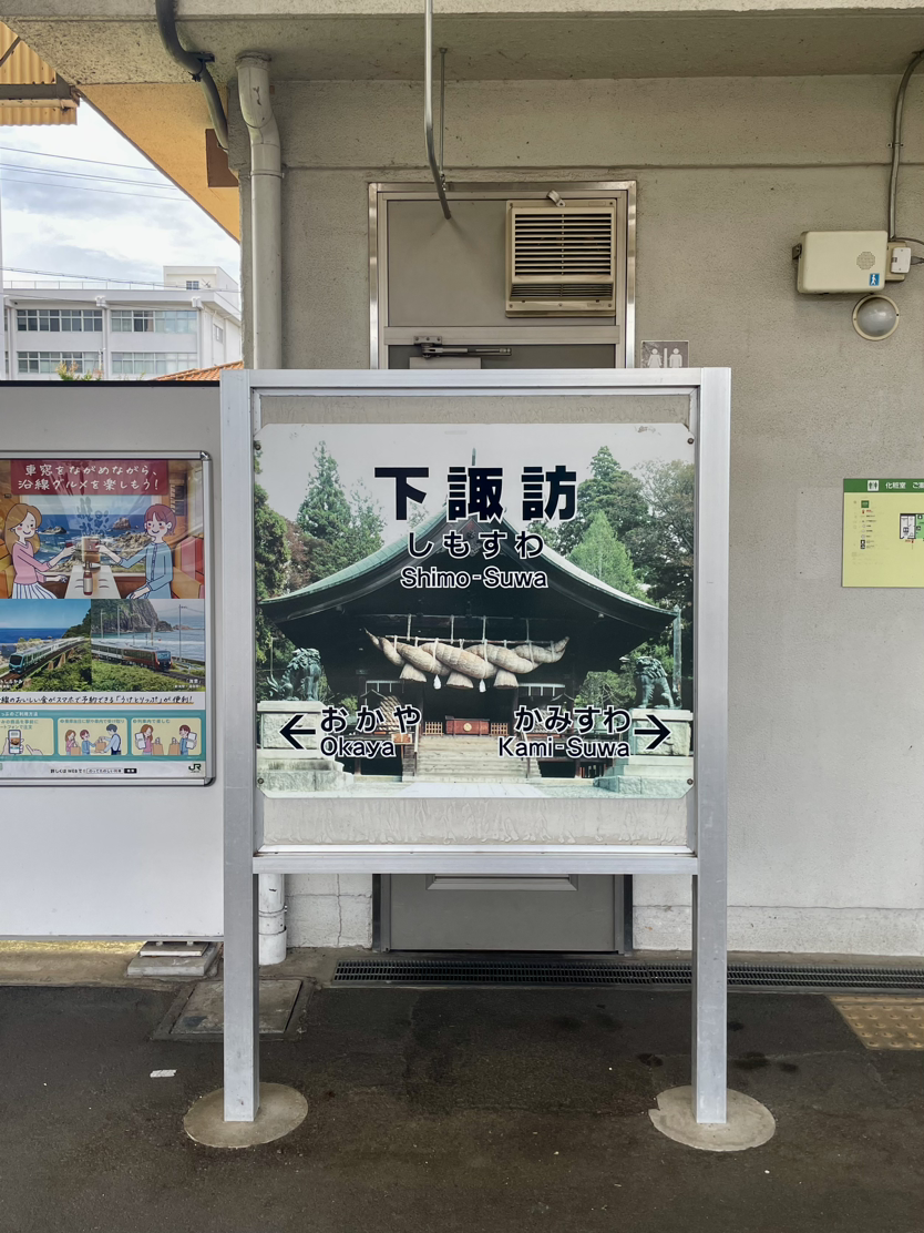 어느새 오카야(岡谷)를 지나 시모스와에 도착. 열차에서 내리자마자 홈 위에 전시된 제구가 눈에 들어왔다. 6년을 주기로 개최되는 스와의 대축제, 온바시라제에 쓰이는 모양이다. 그 규모가 매우 크고 과격해 매년 사상자가 여럿 발생하는 축제로 유명한 온바시라제는, 마을의 남성들이 힘을 합쳐 온바시라(기둥)를 치켜들고 거리를 오가며 축제를 한다. 가장 최근에 개최된 2022년 온바시라제는 코로나 팬데믹의 영향으로 기계의 힘을 빌려서 진행했다고 한다.