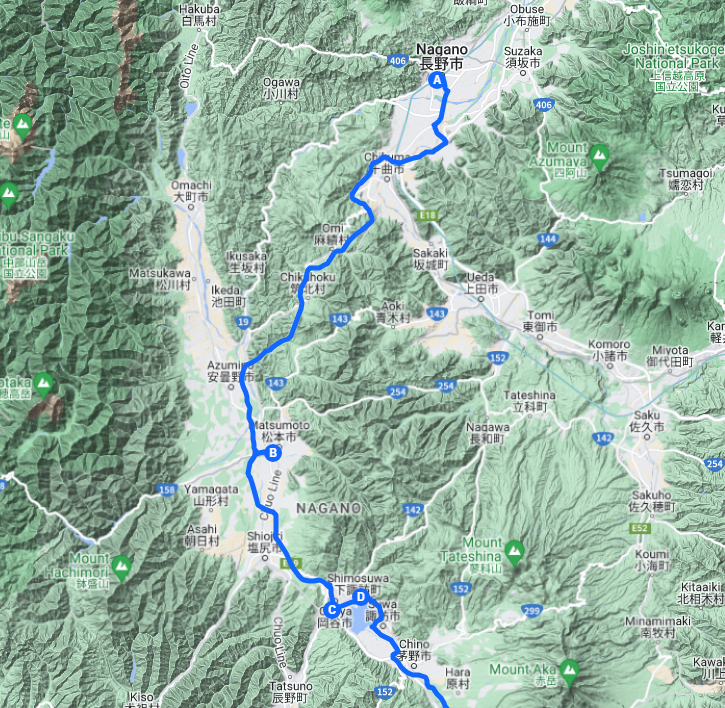 오늘의 목적지인 스와는 유명한 야츠가타케(八ヶ岳) 산기슭에 자리한 스와 호(湖)를 중심으로 형성된 마을이다. 우선 스와에 가기 전에 마츠모토 성을 보기 위해 마츠모토(松本)에 들리기로 했다.