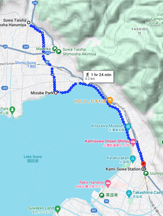 여러모로 생각이 많아졌던 춘궁을 뒤로하고 이제는 카미스와로 이동할 차례이다. 카미스와는 시모스와 역에서 보통열차를 타면 금방이지만 다음 열차 시간이 많이 남아있기도 했고, 모처럼이니 호숫가를 둘러서 걸어가 보기로 했다.