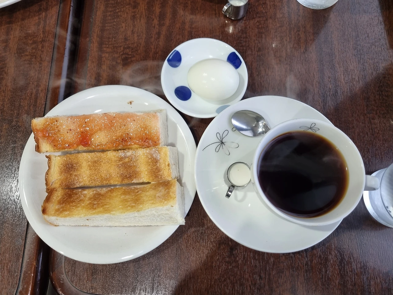 엄빠와 걸어서 도착한 카페는 일부러 찾지 않으면 결코 찾을 수 없는 곳이었다. 바로 옆 건물에는 아침 시장이 열려 있었고, 카페도 테이블이 대여섯 개가 다였다. 카페라곤 하지만 아침 식사도 됐다. 나는 토스트를 시키고 엄빠는 핫도그. 체인점이 아니라는 것, 일본 분위기가 물씬 풍긴다는 것, 맛도 적당하다는 것이 다 마음에 들었다. 토스트에 삶은 달걀이라는 뭔가 의외의 조합도 좋았고.