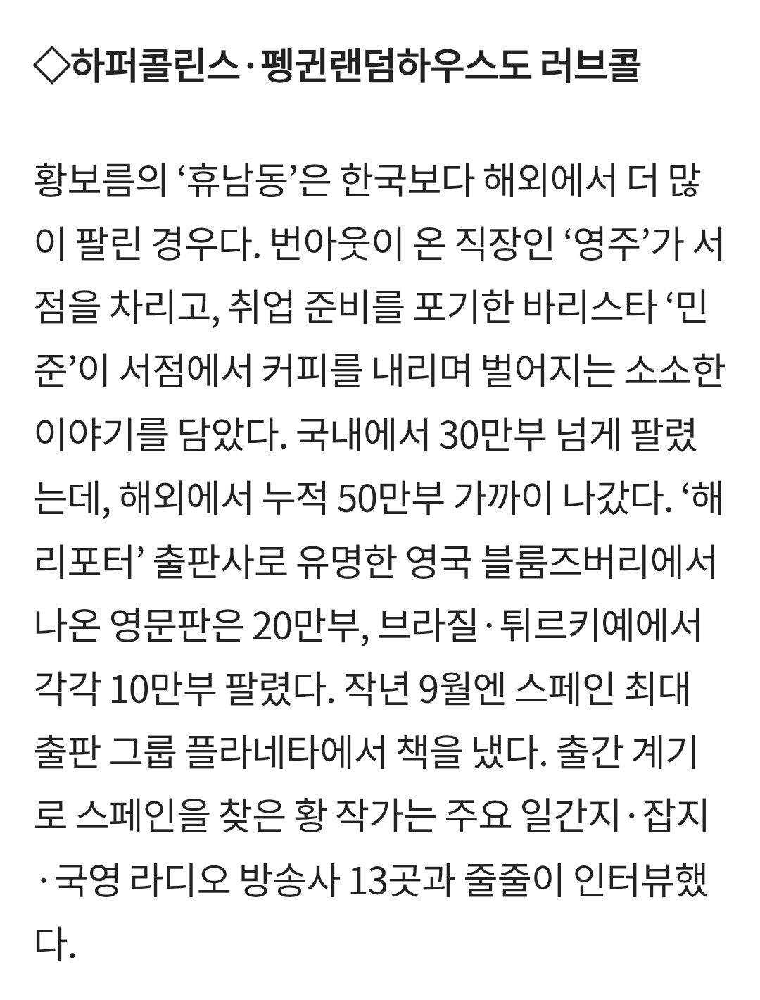휴남동 서점은 놀랍고 감사하게도 해외에서 많은 사랑을 받고 있다. 예전에 어느 분이 이렇게 물었다. 왜 내 책이 여러 나라에서 인기가 있는 거냐고. 보이지 않는 손이 움직인 거냐고. 어떻게 어느 한 나라에서 나온 책이 다른 한 두 나라가 아니라 여러 나라에서 같은 타이밍에 인기가 있을 수 있는지, 도대체 어떤 대단한 이벤트가 있었길래 그렇게 될 수 있었는지 궁금해서 물으신 것 같은데, 그때 나는 이렇게 대답했다. 각 언어마다 출판사가 다르니 '보이지 않는 손'은 존재할 수 없고, 어떻게 이렇게 된 건진 나도 모르겠다고.