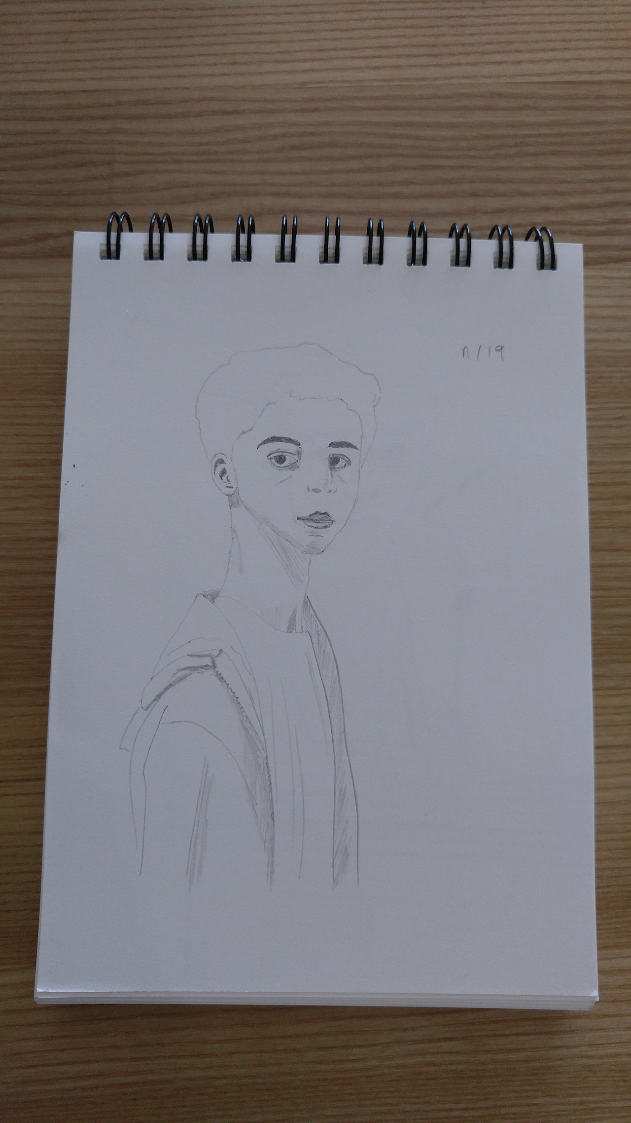 큰 눈에 짙은 쌍꺼풀을 그리고나서 코를 간략하게 그려 넣었다. 이어서 입술. 인중 아래에 입술 산을 그리고 입술 라인을 그었다. 윗입술과 아랫입술을 구분하기 위해 그 사이를 연필로 몇 번 왔다 갔다 했다. 이어 눈썹을 그렸다. 눈썹이 꽤 짙구나. 귀를 그리고 머리를 그리고 이젠 목부터 시작해 몸을 그렸다. 회색 티셔츠에 검은색 후드티를 입고 있다. 색은 표현할 길이 없다. 대신 어설프게 그림자를 군데군데 넣어 주었다. 마지막으로 얼굴에도 그림자를 조금 넣어준다. 난 아직 그림자를 어느 정도 넣어줘야 하는지 잘 모르므로 그냥 최소한으로 넣어준다는 생각으로 넣어줬다. 그림 완성.
