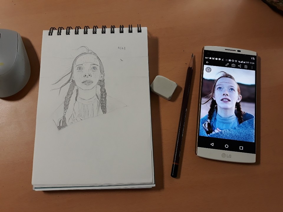 여전히 좌우 균형이 잘 맞지 않지만 오늘은 여기서 그만 그리기로 했다. 내가 그린 앤은 위가 아닌 정면을 바라보고 있다는 면에서, 원본의 앤보다 다섯 살쯤 더 나이가 많아 보인다는 면에서, 원본의 앤보다 살짝 살이 더 붙고 조금 더 무표정해 보인다는 면에서, 원본의 앤과 많이 다르다. 그래도 난 원본의 이미지를 덮고 내가 그린 그림을 보면서 나름 만족했다. 이 정도면 됐다는 느낌이다. 오늘은 이 정도면 됐다는 느낌. 이 느낌에 의지해 계속 그리면 될 것 같다.