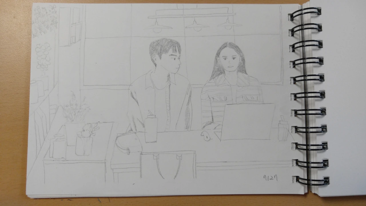 만화책 따라 그리는 데 흥미가 떨어져서 며칠 전부터 영화나 드라마 장면을 그리고 있다. 오늘은 한 면을 가득 채우는 무지 큰 얼굴을 그리려다가 실패했다. 인물이 짓는 슬픈 표정을 그림으로 옮겨보려 했으나, 전혀 옮겨지지 않았다. 그 그림엔 '실패'라고 적어놓고 다시 다른 그림을 그렸다. 두 인물이 카페에 앉아 있는 모습. 여자가 노트북을 하다가 머리를 굴리며 뭔가 아이디어를 내고 있고, 남자는 몸을 여자 쪽으로 조금 기울인 채 노트북 화면을 보고 있다. 카페 세팅이 참 예쁘게 돼 있었는데 그걸 십 분의 일도 제대로 표현하지 못했다. 그럼에도 이 그림은 실패는 아니라는 생각에 오늘의 날짜 '7/27'을 적어 넣었다. 아직 도착역까지 몇 정거장 남았다. 오늘도 무사히 그림도 그리고 글도 썼다!