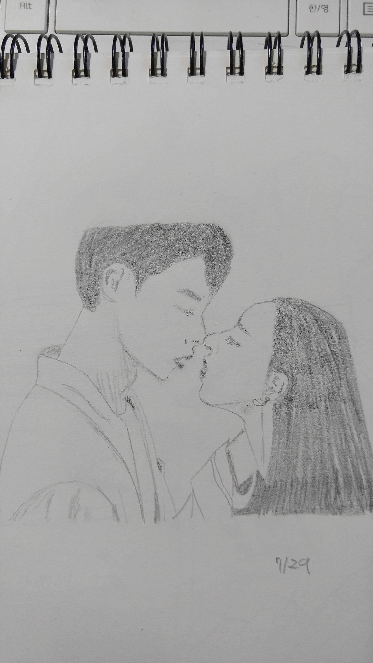 예상했겠지만, 여기까지 '그 장면'에 관해 글을 쓴 건 오늘 그린 그림이 설지환과 차현의 키스신이기 때문이다. 진짜 키스하는 모습보다 더 분위기 있었던 키스하기 0.1초 전 모습. 가장 그리기 어려웠던 건 설지환의 눈과 입술이었다. 눈동자를 어떻게 해야 게슴츠레하면서도 야한 눈이 될지 여러 번 그렸다가 지우기를 반복했다. 입술도 마찬가지. 설지환을 그리고나서 차현은 비교적 빨리 그렸다. 아마 눈동자를 그리지 않아도 됐기에 그랬던 것 같다.