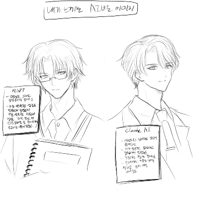 chatGPT와 클로드를 사용해 보고 '오답노트 열심히 쓰는 공대생', '유능하고 친절한 비서'라는 이미지를 잡은 뒤 재미 삼아 둘을 의인화시켜서 낙서해 봤다.