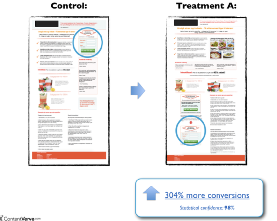 이후 디자이너는 우측처럼 디자인을 변경했습니다. 결과는 놀라웠는데요, 양식폼과 CTA 위치를 아래로 변경했더니 회원가입률이 304%나 올라간 것입니다. 이를 통해 우리는 어떤 학습을 할 수 있을까요? 저는 제품이나 개요가 복잡할 경우 고객이 결정을 내리기 전 충분히 매력적인 정보를 제공한 뒤 CTA를 제공해야 한다는 생각이 들었습니다. 혹시 기계적으로 CTA를 가장 상단(Average fold)에 배치하고 있지는 않았나요?
