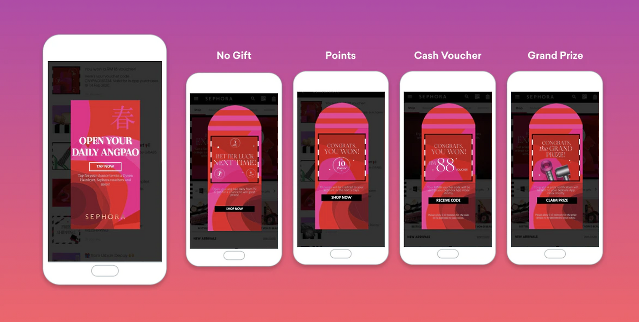 마케팅 자동화 툴인 Braze의 연구에 따르면 인앱 메시지를 수신한 경우 131% 높은 인게이지먼트를 보였습니다. 거의 모든 앱 내 유저 여정에서 도움이 될 수 있는 형태로 개입할 수 있기 때문입니다. 아래는 코스메틱 브랜드 세포라의 인앱 메시지 활용 모습입니다. 캠페인은 말레이시아 고객들을 상태로 설 연휴 동안 '앙파오스'라는 빨간색 봉투를 시각화하는 이벤트를 펼쳤습니다. 선물을 확인한 고객들에게 실시간으로 개인 정보를 입력한 뒤 프로필에 추가할 수 있는 인앱메시지를 발송한 것입니다. 이후 캠페인 대상인 고객이 132% 더 많이 구매한 사실을 확인했습니다.