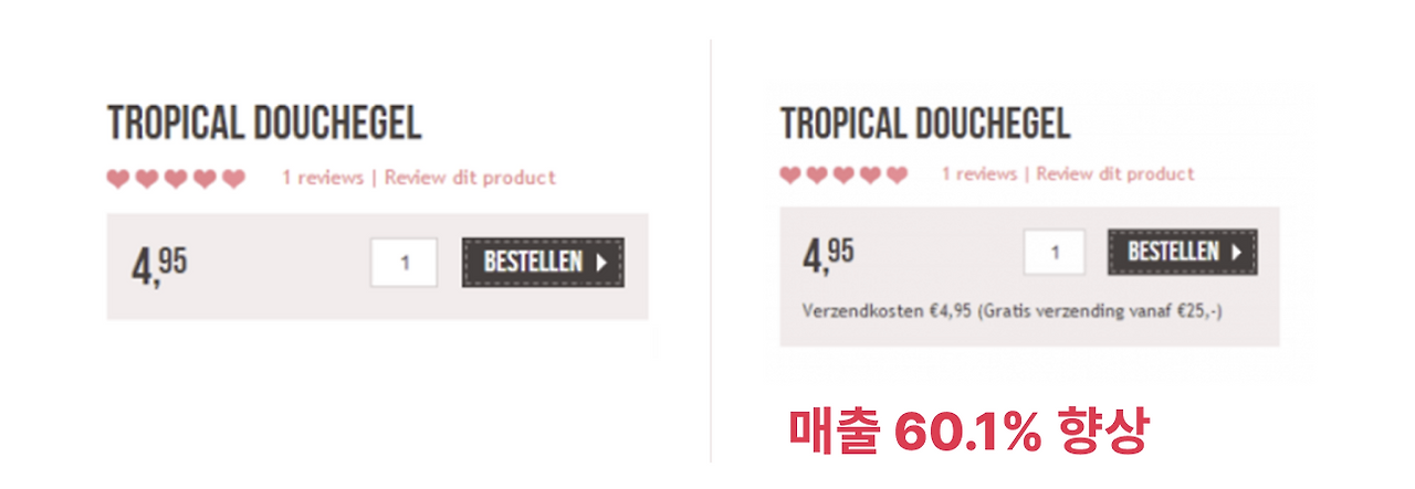 왼쪽은 CTA 주변에 클릭 트리거가 존재하지 않습니다. 반면 우측은 버튼 아래 '배송료 4.95유로(25유로 잇아 주문 시 무료 배송)'라는 클릭 트리거를 추가했습니다. 이로 인해 매출은 60.1% 향상되었습니다. 이 사이트의 구매자들은 화면이 조금 복잡해지더라도 주문 시 더 자세한 정보를 긍정적으로 인식한 듯합니다. 다음은 클릭 트리거는 아니지만 마이크로카피의 디테일에 관한 흥미로운 실패 사례입니다.