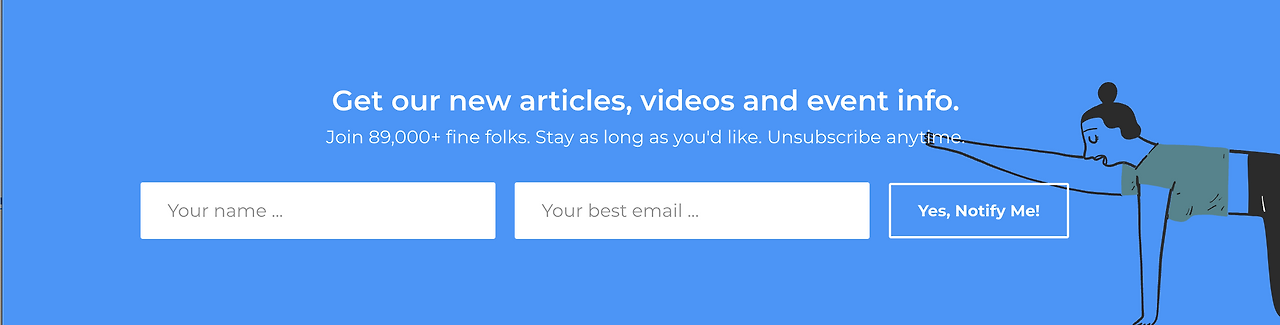 에어비앤비의 클릭 트리거는 심리적인 장벽을 낮추는 효과가 있습니다. 많은 사람들이 다른 서비스에서 예약하기 버튼을 눌렀더니 바로 결제가 되는 경험을 한 적이 있을 것입니다. 저는 비행기 예약 사이트에서 유사한 경험이 있었습니다. 그래서 이런 유의 예약 버튼 앞에 서면 주춤하곤 합니다. 그런데 에어비앤비가 배치한 클릭 트리거는 이러한 사용자의 의구심을 해소하는 역할을 하고 있습니다. 특히 여행이나 숙박 관련된 카테고리에서 현명한 클릭 트리거 전략처럼 느껴집니다. 마지막은 위에서 잠깐 소개했던 Copyhackers 사이트 최하단에 존재하는 뉴스레터 구독 영역입니다.