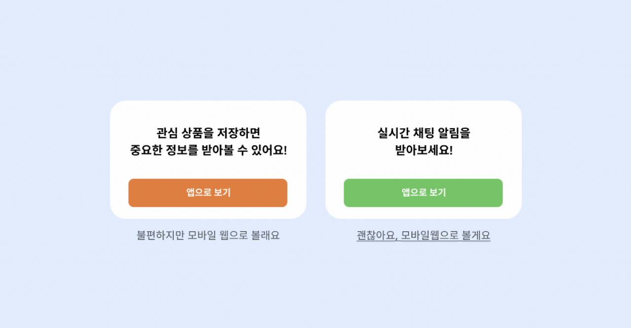 아래 그림 5의 변형된 투버튼 선택 팝업 역시 대표적인 다크패턴이다. 볼드한 버튼의 '앱으로 보기'에 비해 '괜찮아요, 모바일웹으로 볼게요'는 극도로 가독성 낮게 디자인된다. 이미 너무 많은 곳에서 남용되고 있어 다크패턴으로도 인식하지 않는 것 같아 어떨 때는 마음이 아프다.