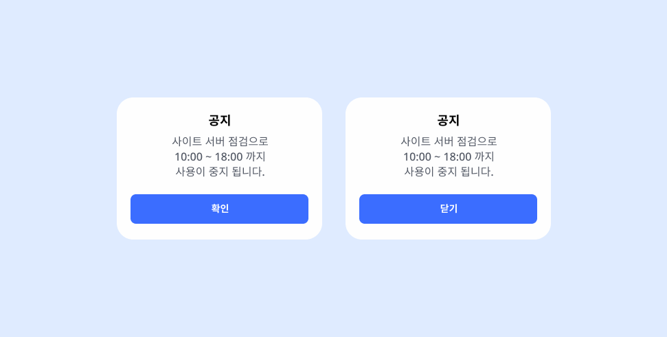 원버튼 팝업의 목적은 사용자가 꼭 확인해야 할 정보를 스스로 컨펌하게 하는 것이다. 따라서 메시지는 간결하고 이해하기 쉬워야 한다. 버튼명 역시 '확인', '닫기', '완료'처럼 사용자가 수행할 행동이 명확해야 한다. 그런데 버튼명의 차이로 미묘한 뉘앙스 변화가 일어난다.