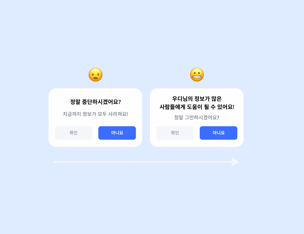 투버튼 선택 팝업에는 초반에 소개한 다크패턴이 많이 등장한다. 디지털 문법상 우측 버튼은 '확인'이나 경로의 '진행'을 뜻하고 좌측은 ‘취소‘나 뒤로 가기를 뜻한다. 디지털 세상의 오래된 암묵적 약속이다. 그런데 두 기능의 위치를 교묘히 바꾸면 사용자가 무의식에 실수를 저지르기 쉽다.