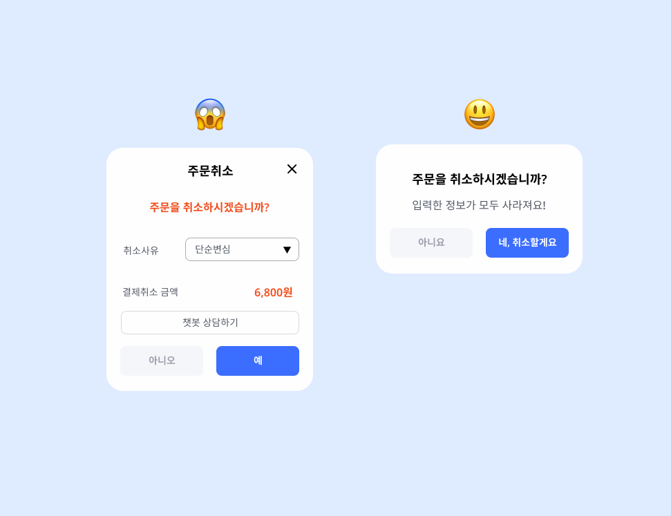 좌측 팝업에는 결정을 위한 두 가지 버튼 타입, 다른 링크로 연결되는 '챗봇 상담하기', 취소사유를 고르는 '드롭다운', 화면을 끄는 '엑스' 아이콘이 존재한다. 단순변심과 챗봇 상담하기 영역은 명도 차이는 있지만 비슷한 라인 디자인이다. 결제취소 금액과 본문에는 강조를 위한 붉은색이 적용되었다.