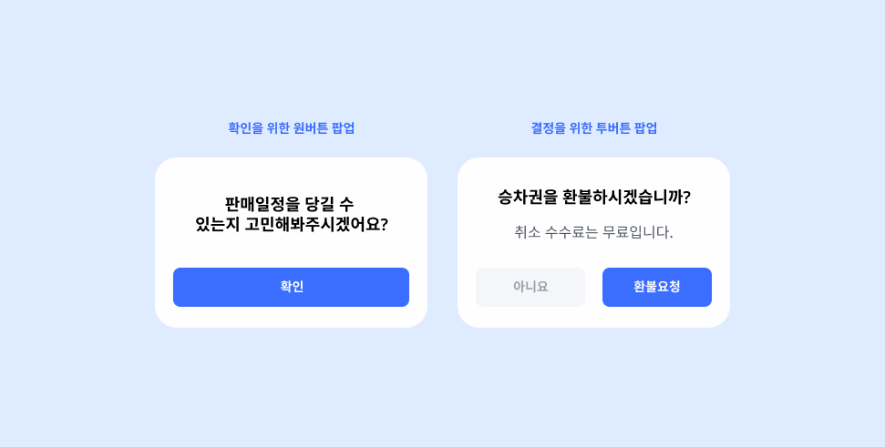 팝업의 존재 이유는 사용자의 주의를 끌만큼 중요한 '확인'이나 '결정'을 받기 위해서이다. 아래 그림 2처럼 논리구조상 '확인'에는 원버튼, '결정'에는 투버튼이 자연스레 사용된다. 이 두 유형의 팝업은 사용되는 상황과 요구하는 사용자의 참여 수준이 크게 다르다. 하나씩 살펴보도록 하자.