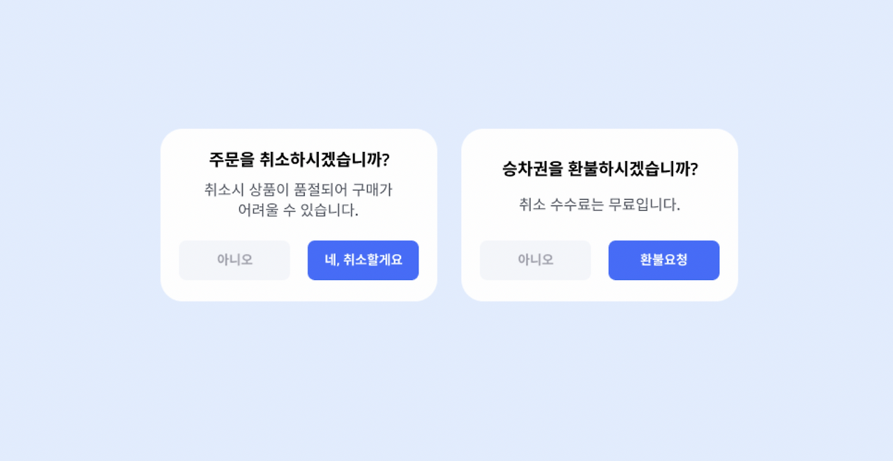 우측처럼 제목과 본문에 '주문취소'가 중복되는 경우도 팝업을 무겁게 만든다. 이런 경우 본문을 없애고 제목에 주문을 취소하시겠습니까?라고 쓰는 편이 낫다. 제목에는 사용자가 취할 액션에 대한 내용이 직관적으로 담겨야 한다. 우측 컨펌 버튼은 이와 호응관계를 가져야 이해가 쉽다. 본문에는 컨펌 버튼 클릭 시 일어날 내용을 담으면 중복을 피하고 유용한 정보를 줄 수 있다.
