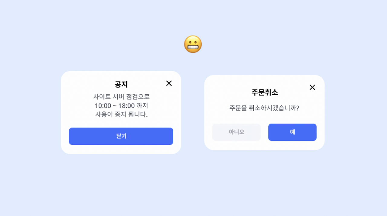 아마 많은 분들이 비슷한 경험이 있으리라 생각한다. 그만큼 팝업은 이탈이나 앱 삭제와 연관성이 큰 컴포넌트이기도 하다. 지금부터 한 발 더 들어가 팝업의 대표적인 두 가지 형식인 '원 버튼 확인 팝업'과 '투 버튼 선택 팝업'에 대해 알아보자.