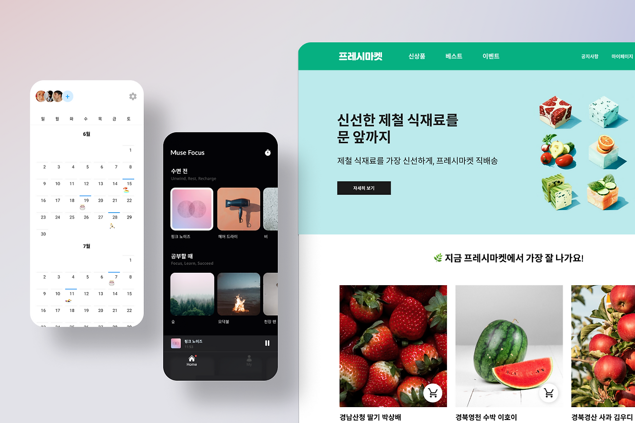 이번 강의에서는 과거 제 커리어와 관련이 있는 세 가지 가상의 프로젝트 Fresh Market(신선 식재료 서비스), Muse Focus(집중력 향상 앱), Family Hub(가족형 공유 캘린더 앱)를 직접 만들어 볼 예정입니다. 이를 통해 비즈니스를 고려한 프로덕트 디자인의 전 과정을 배우고 싶은 분들에게 도움을 드리려고 합니다.