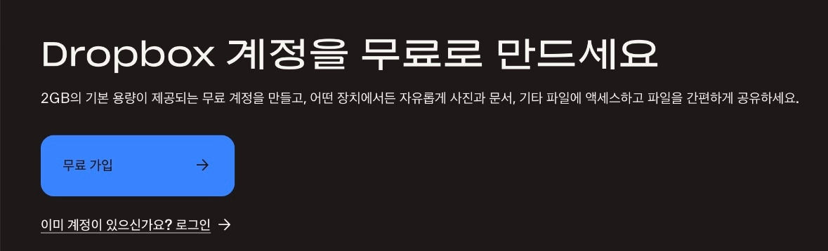 "2GB의 기본 용량이 제공되는 무료 계정을 만들고, 어떤 장치에서든 자유롭게 사진과 문서, 기타 파일에 액세스 하고 파일을 간편하게 공유하세요."라는 문구를 사용했습니다. 이는 사용자에게 즉각적인 혜택을 명확히 제시하여 가입을 유도하는 효과적인 UX 라이팅의 예시입니다.