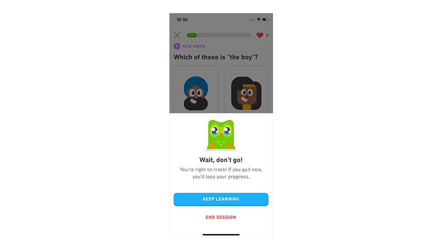 UX 라이팅의 역할 중 하나는 적절히 인간적인 면을 드러내 동기 부여를 하는 것입니다. Duolingo는 사용자가 학습을 중단하지 않도록 "Keep Learning"이라는 버튼 문구를 강조합니다. Duolingo의 교육에 대한 철학을 드러내며 사용자가 학습을 계속하도록 동기 부여합니다. 적절히 배치된 친근하고 개인화된 메시지는 사용자 경험을 향상합니다.