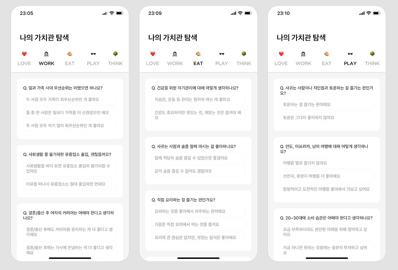 Q: 왜 소개팅 앱에서 'LOVE', 'WORK', 'EAT', 'PLAY', 'THINK'와 같은 카테고리로 나누었을까?