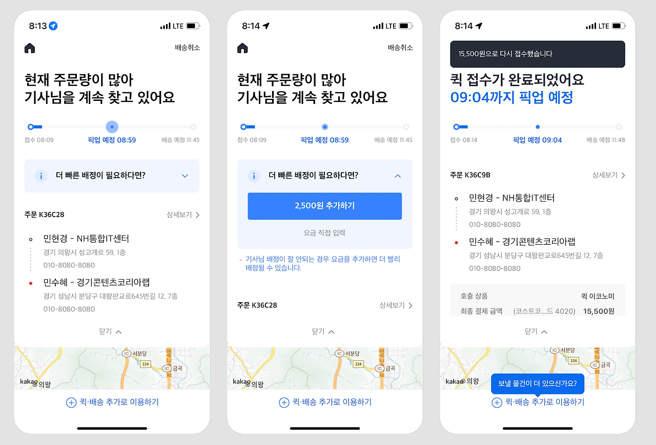 첫 번째 화면: "현재 주문량이 많아 기사님을 계속 찾고 있어요"