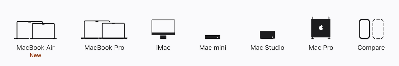 애플 웹사이트의 제품 나열 방식. 비슷한 제품군을 근접하게 배치하고 동일한 스타일로 디자인합니다. 보는 사람은 이를 유사 제품 그룹으로 인식합니다.