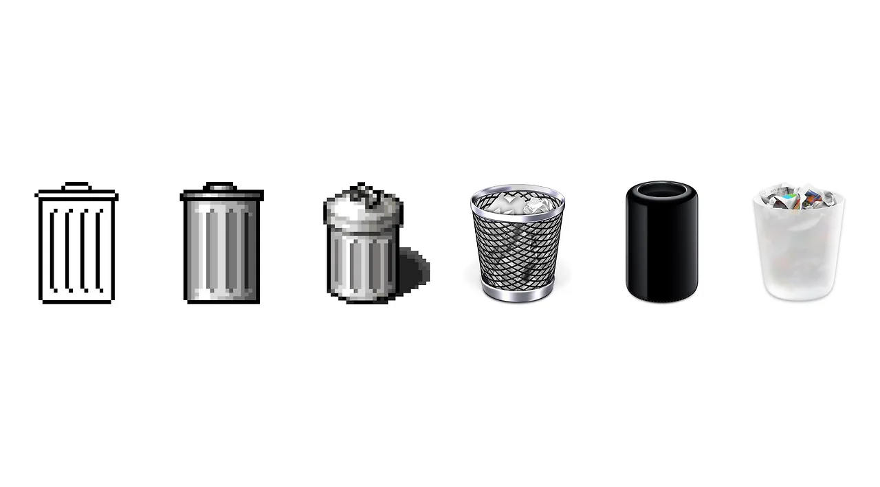 애플의 '휴지통' 아이콘이 상징적입니다. 현실 세계의 휴지통 개념을 디지털 환경에 적용하여 사용자가 직관적으로 이해할 수 있게 했습니다. 플로피 디스크 아이콘이 지금까지 활용되는 이유이기도 합니다.