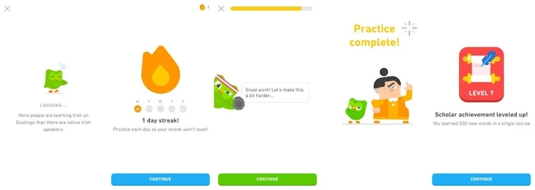 스픽, 듀오링고 같은 교육 앱의 칭찬 메시지가 해당합니다. 사용자가 문제를 풀거나 과정을 통과할 때마다 바로 긍정적인 피드백을 제공합니다. UX에서 딜믹의 법칙은 긍정성 외에도 즉각적 피드백으로 사용자의 불확실성을 감소시키는 역할을 합니다. 사용자는 내 행동을 시스템이 인식하고 있다고 생각해 신뢰도가 올라갑니다.